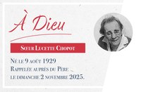 Sr Lucette CHOPOT, membre des Filles de la Sagesse, a servi à Tulle durant 18 ans, dans le quartier de Souilhac. Les obsèques auront le lieu le jeudi 6 novembre à Saint-Laurent-sur-Sèvres.