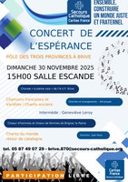 Le Secours Catholique de Brive organise un concert le dimanche 30 novembre 15h à l'espace Professeur Jean-Paul Escande, Pôle des 3 Provinces à Brive