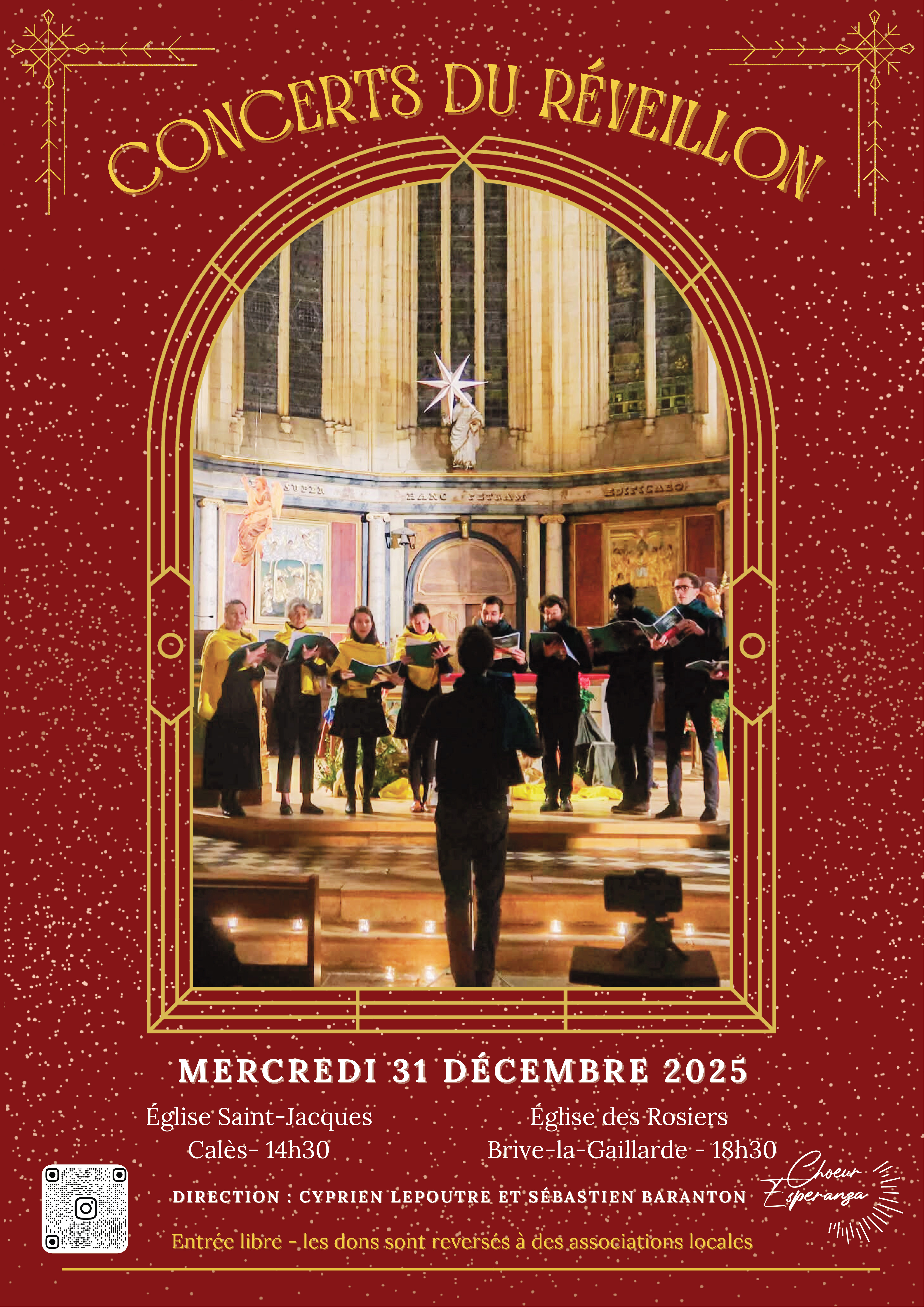 À Brive-la-Gaillarde, le Choeur Esperanza, ensemble vocal amateur composé d’une trentaine de choristes, vous convie à un concert pour le réveillon en Corrèze au profit des Servantes des Pauvres, le mercredi 31 décembre à 18h30, en l'église des Rosiers de Brive-la-Gaillarde.